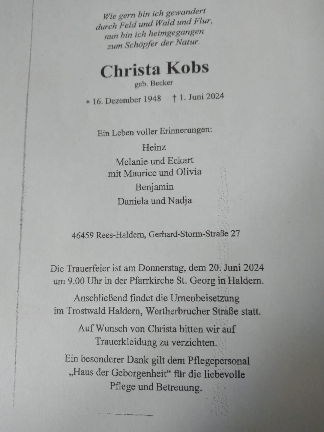Heinrich Wilhelm (Heinz) Kobs is geboren op 28-12-1946 in Isselburg (NRW - Dld), zoon van Bernhard (Bernd) Kobs en Johanna Antonia (Anna) Tempels. Heinz trouwde, 21 jaar oud, op 19-07-1968 met Christa Maria Becker, 19 jaar oud. Christa is geboren op 16-12-1948 in Haldern (NRW Dld).Christa is overleden op zaterdag 1 juni 2024 in Rees- Haldern, 75 jaar oud. Zij is gecremeerd op donderdag 20 juni 2024, urn bijzetting in het Troostwald te Haldern